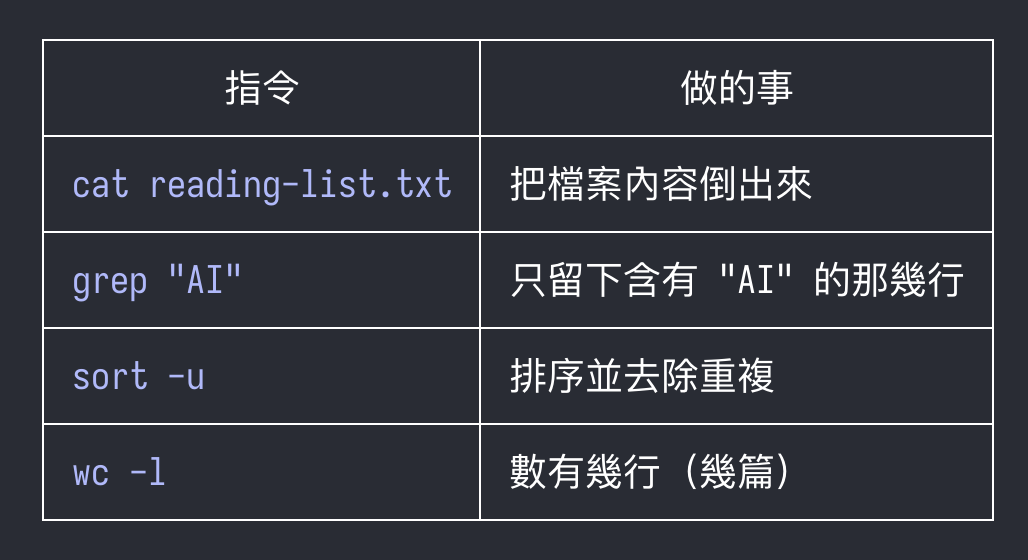 舉個例子,假設你想從一份閱讀清單 (reading-list.txt ) 中,找出讀過幾篇跟 AI 相關的文章,你可以利用 pipe 串接 4 個不同的工具達成: