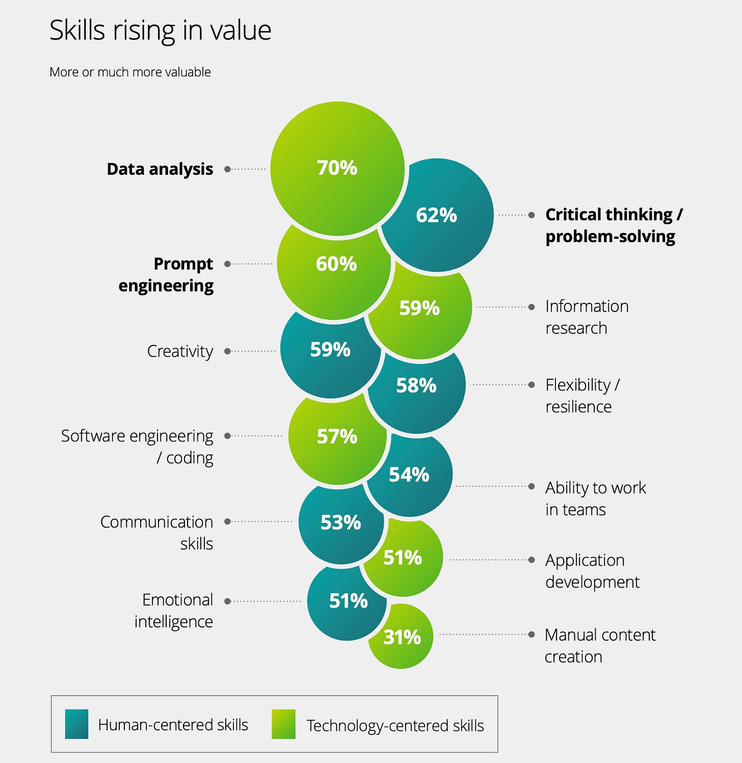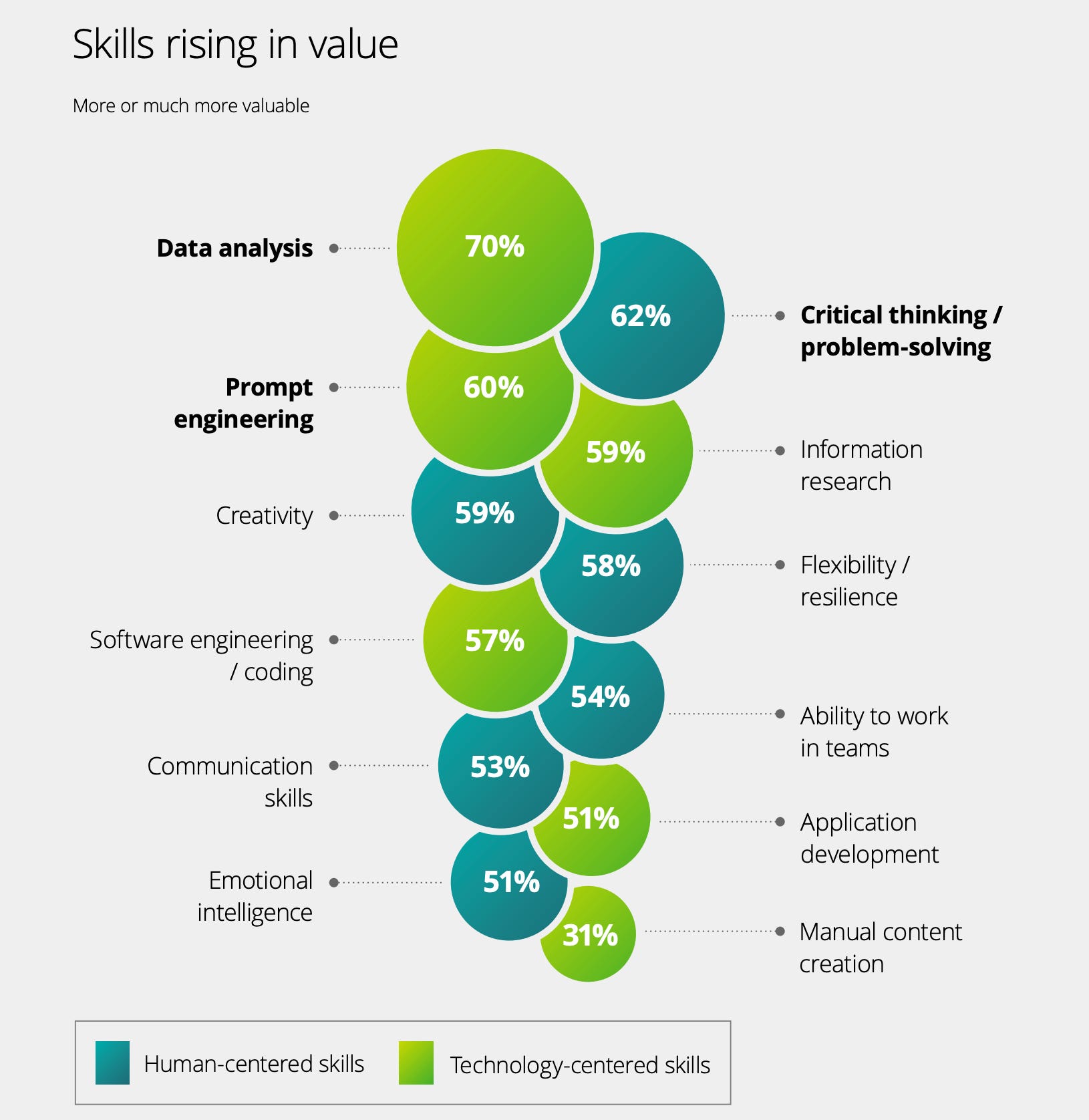 從 Deloitte 的報告中 [4] 可以看到 (如上圖),”Human-centered skills” 在 AI 時代下的重要性大幅提升,Technology-centered skills 在資料分析和信息篩選上有所提升,Coding 和手動內容的產出則下降許多。