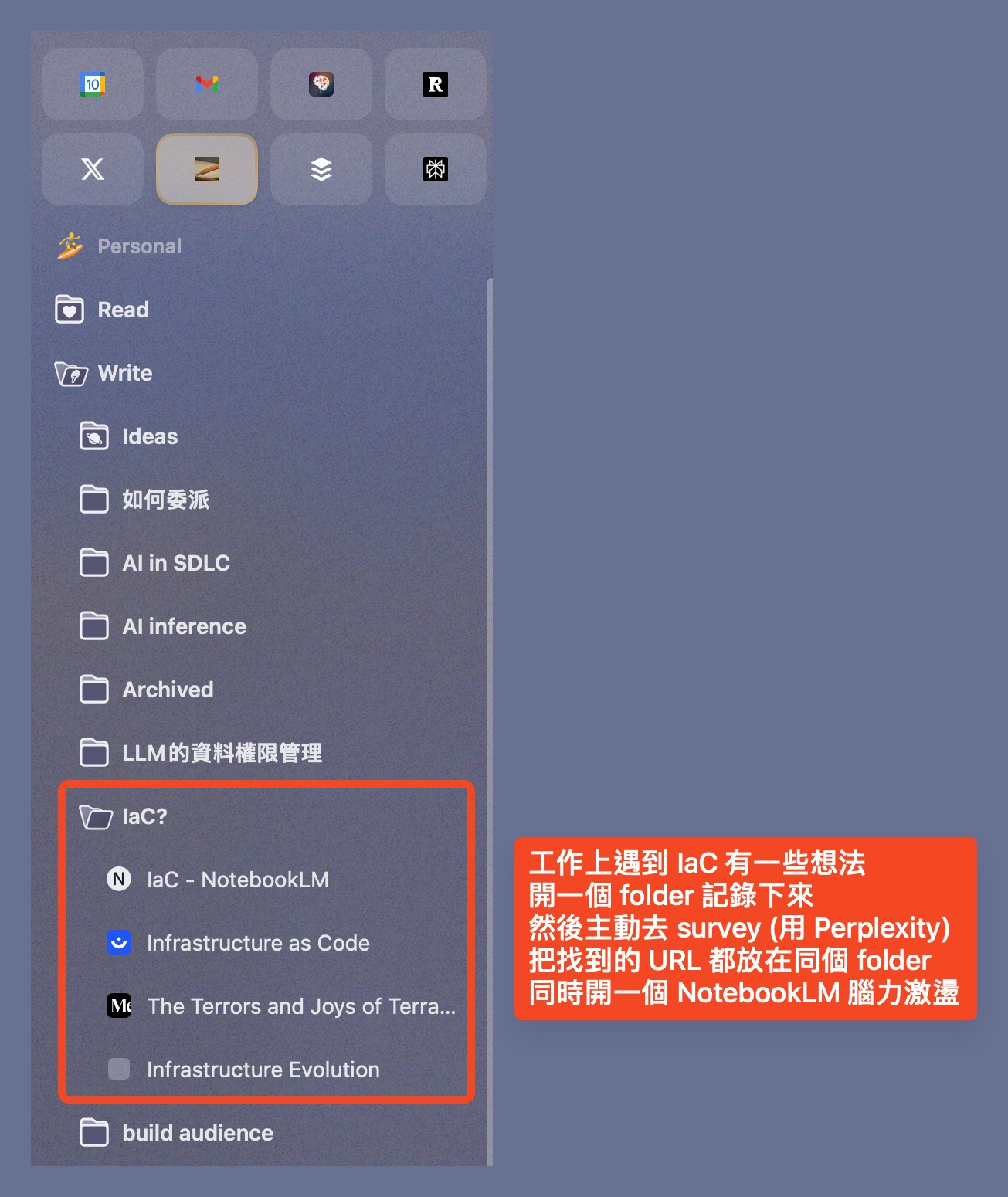 Arc:有時候讀到一篇內容,或是看到一則社群貼文,忽然靈光一閃,有一個自己覺得足夠獨特的想法時,我會直接在 Arc 瀏覽器開一個 folder 然後把那篇內容放進去。