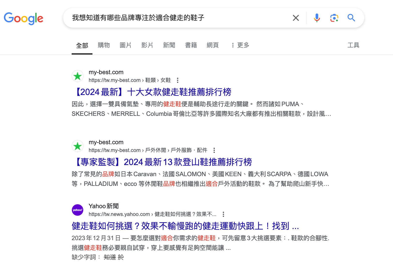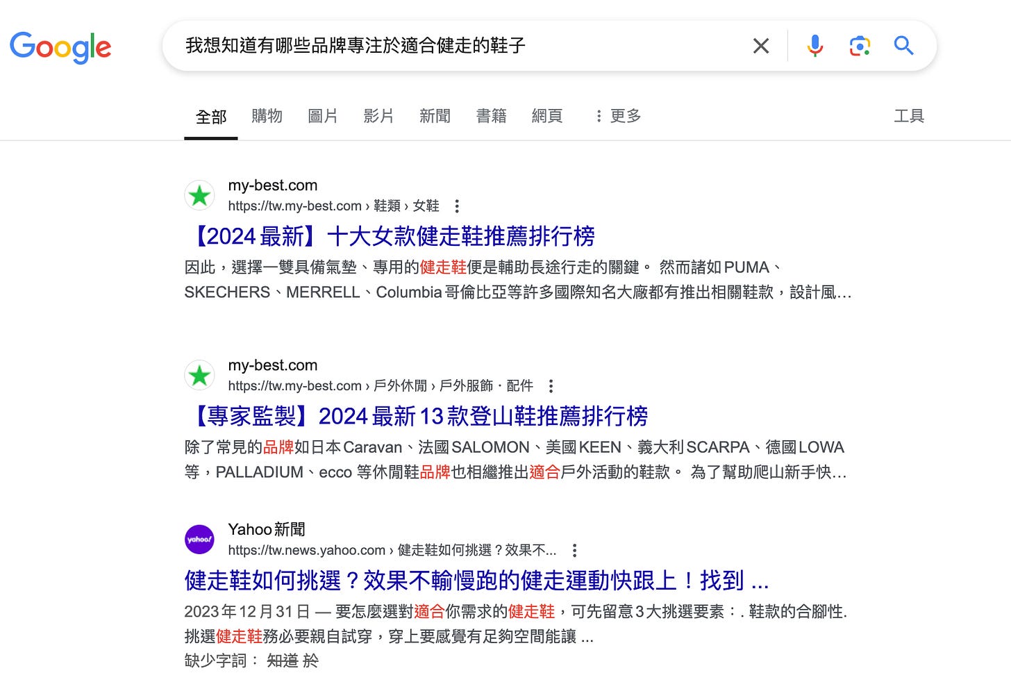如上圖,可以看到 Exa 的結果直接列出品牌的官方網站,正面答復了我的問題,更切合我的需求,不會推給我什麼 2024 鞋子評測或是如何挑選鞋款這種跟我的問題沒有直接關聯的回答。