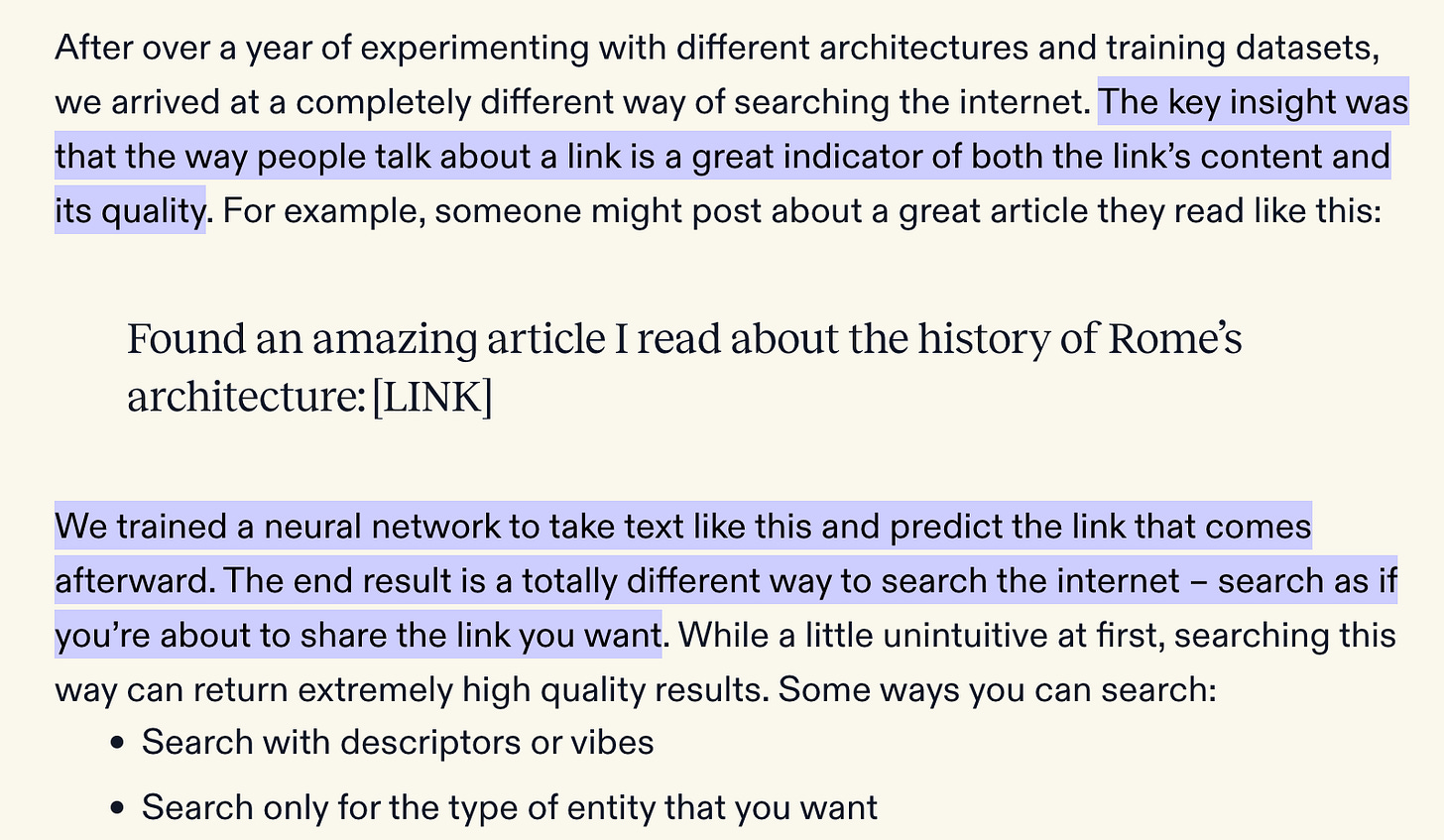 此外,其官網部落格也透漏出,它利用 LLM 的方式去訓練一種他們認為好的搜索結果應該具備的特質:
