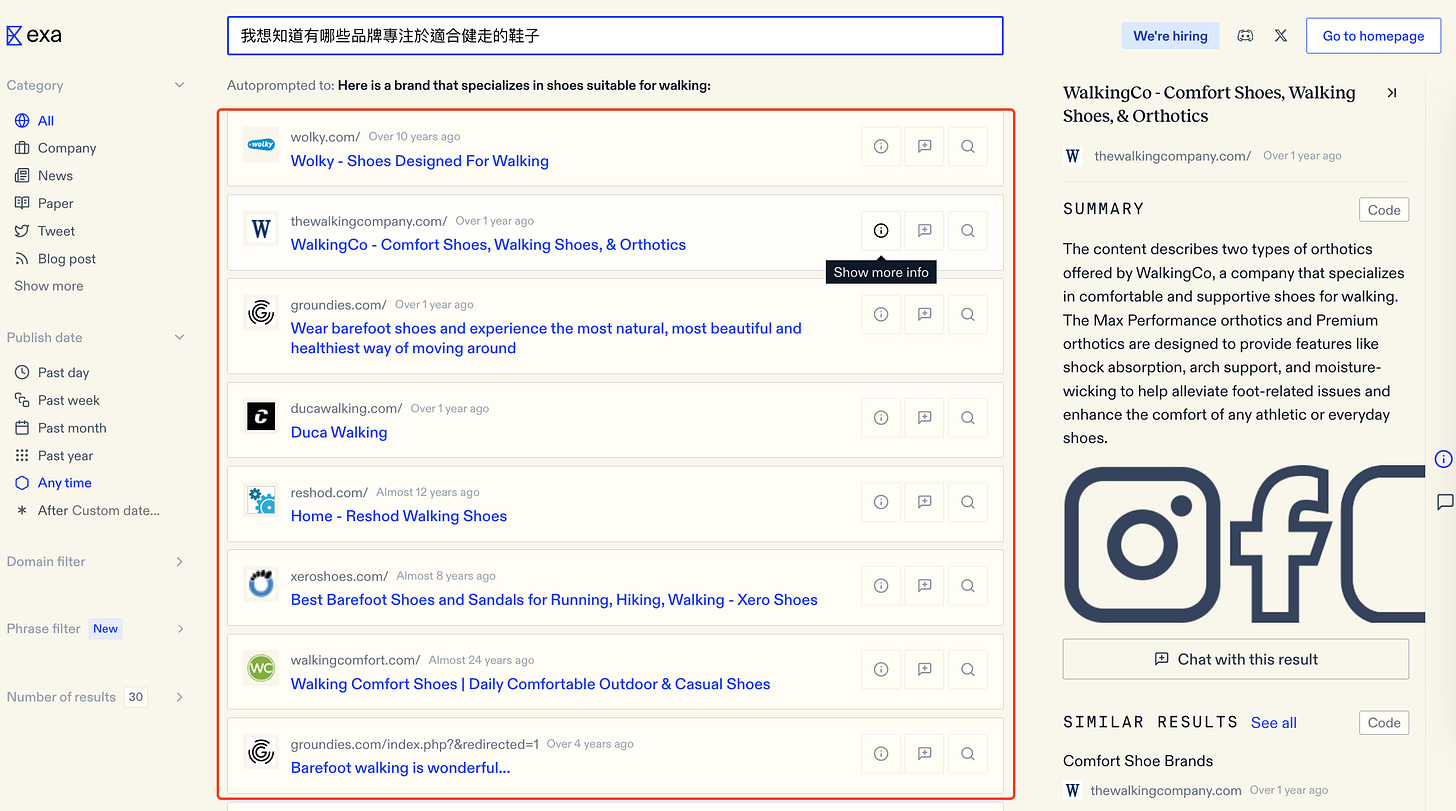 如上圖,我輸入的查詢是:「我想知道有哪些品牌專注於適合健走的鞋子」,但是 Google 前面幾筆查詢結果是一些評測文還有如何挑選鞋款的文章,濃濃的商業氣息。這也不能怪它,畢竟搜尋引擎的商業模式,本來就是靠競爭注意力來轉起這個神奇飛輪。那麼,同樣的搜尋,在 Exa 裡面會得到什麼結果呢?