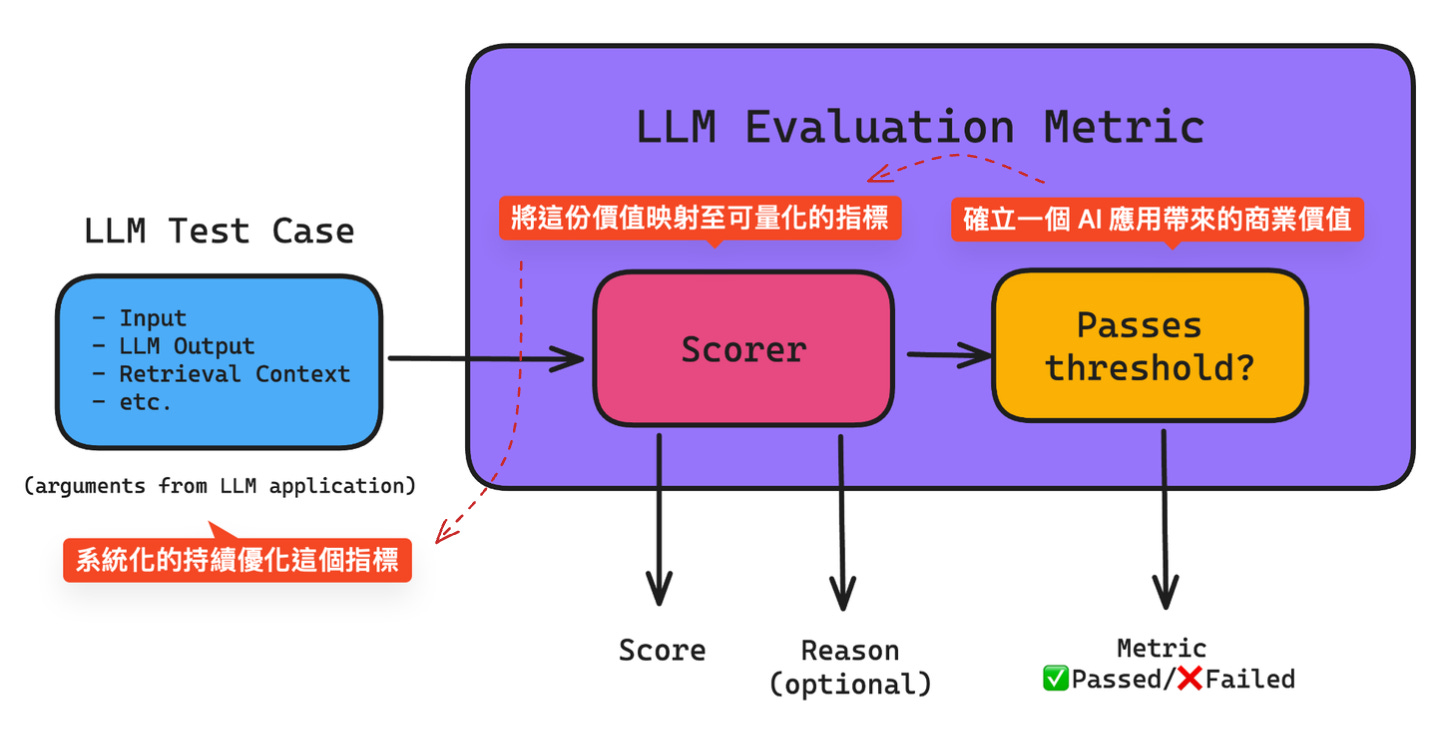 將這份價值映射至可量化的指標:商業價值的 threshold 可以由一或多個客觀的技術指標綜合而得 (上圖中 Scorer),這些技術指標可以透過系統化的持續優化 (上圖左 LLM Test Case),在每一次的 prompt 調整後,客觀的告訴我們哪些 case 表現提升了、那些 case 表現下降了。