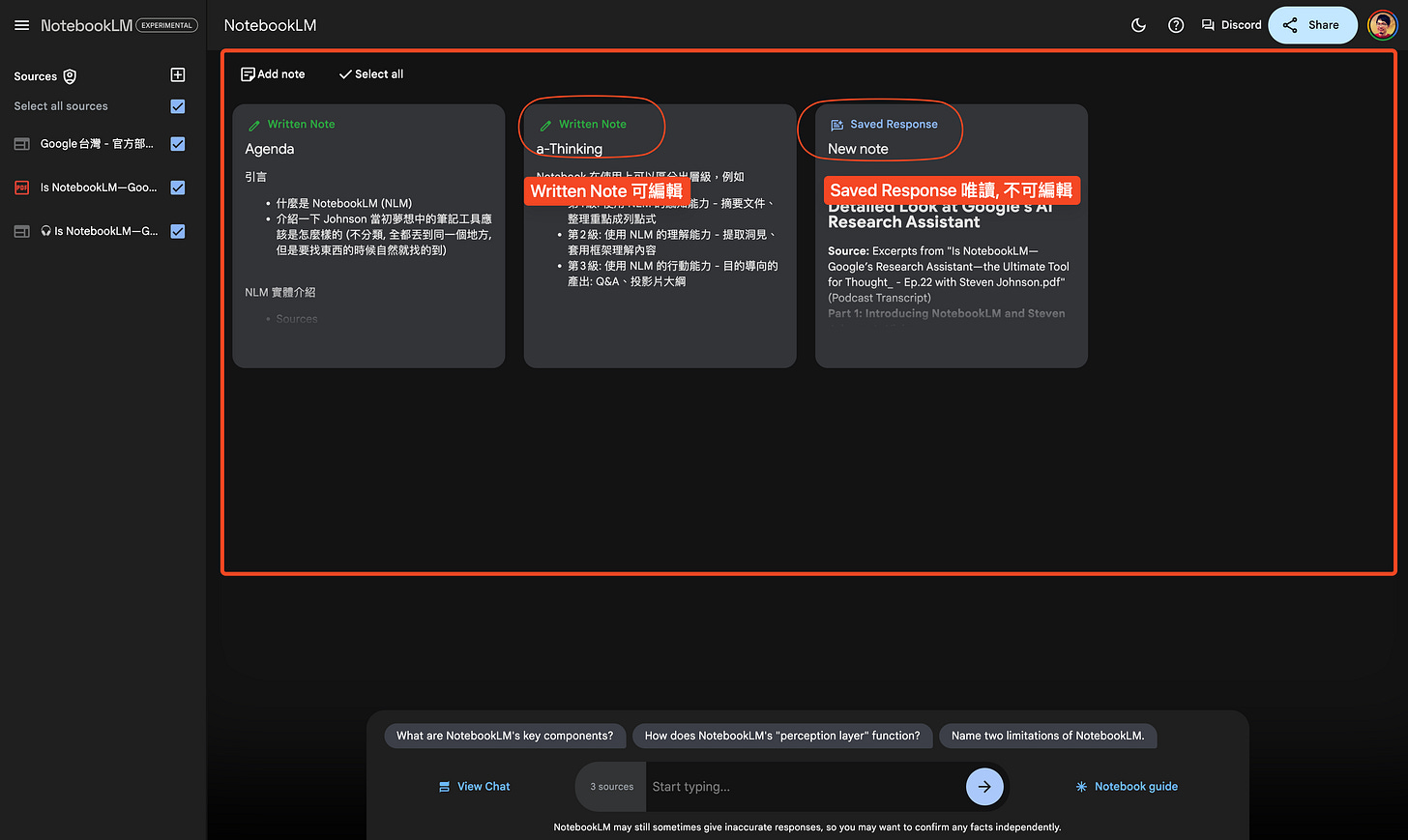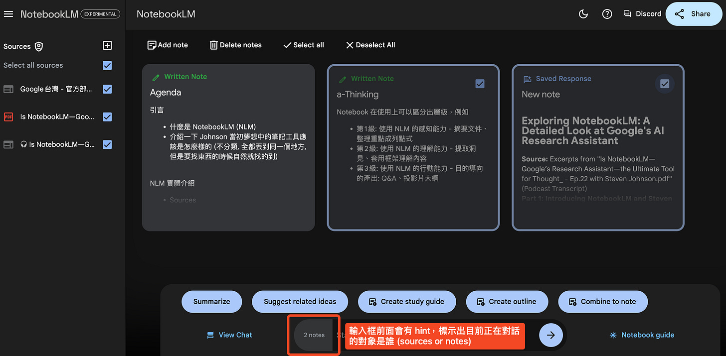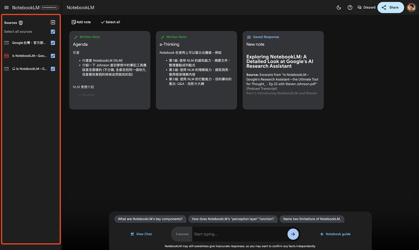 Sources 是 NLM 的事實基礎,用戶與 NLM 的對話一開始也都是圍繞在 Sources 上面 (為什麼說是一開始呢? 因為後面會提到,對話也可以圍繞在 Notes 上)。