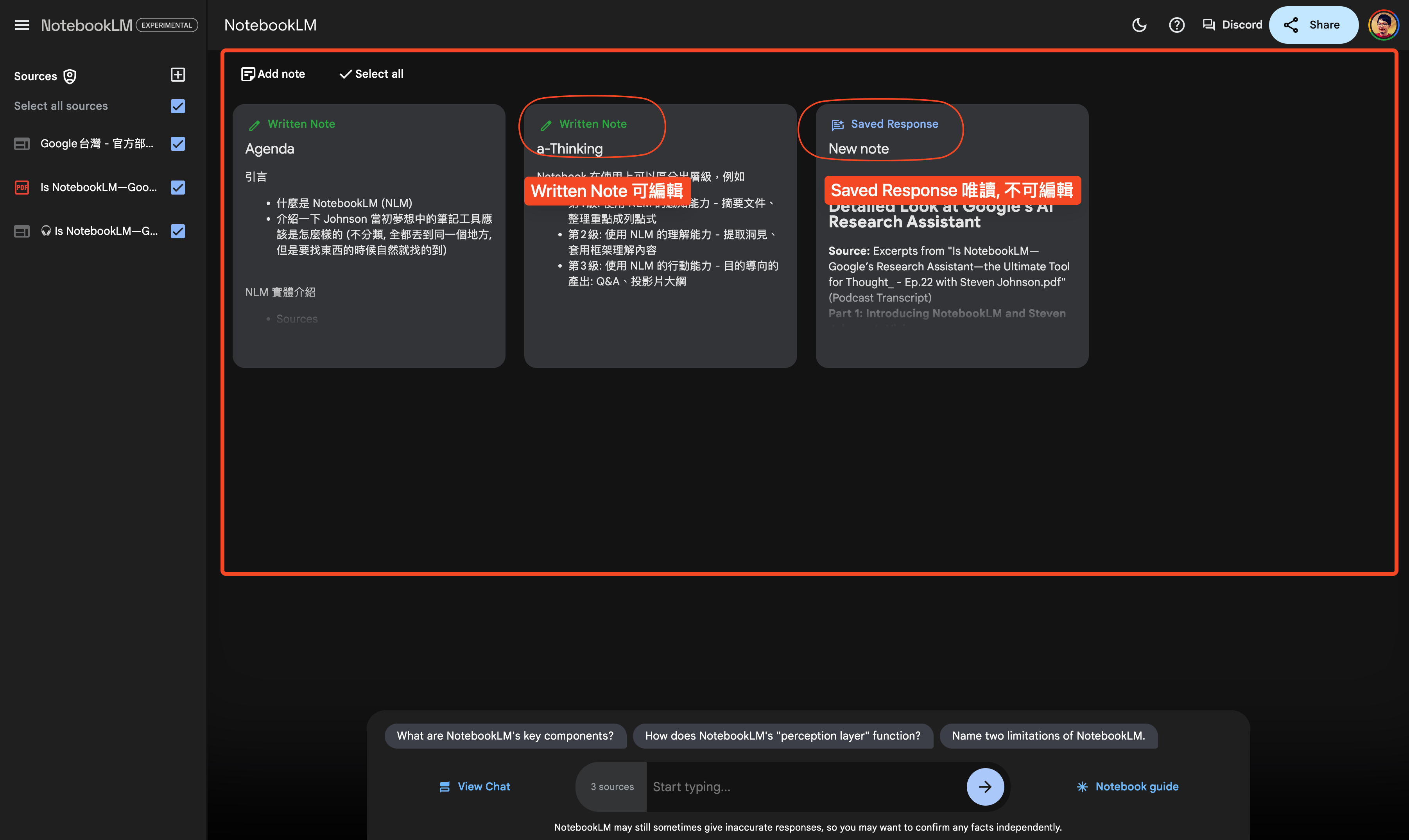 Notes 是用戶保存重要信息的地方。你可以直接寫筆記 (這種叫做 Written Note,透過 <Add note> 創建出來的筆記);也可以將對談中 NLM 的回應保存下來 (這種叫做 Saved Response,在 AI 回應的訊息右上角點選 <Pin this message to a note>)。這些筆記會顯示在頂部,方便隨時查看和使用。