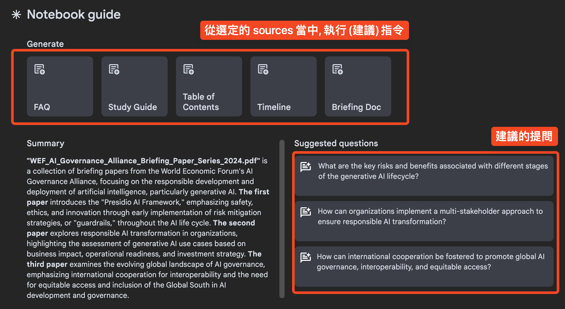 Commands 是 NLM 內建提供的一系列任務與操作,例如:摘要、生成大綱、協助理解等等…。也能根據你和 sources 之間的對話,來推斷可能你接下來感興趣的 follow-up questons。如上圖,當你上傳 source 的時候,會跳出 Notebook guide,當中有一些建議的指令,對於快速了解 sources 有蠻大的幫助。