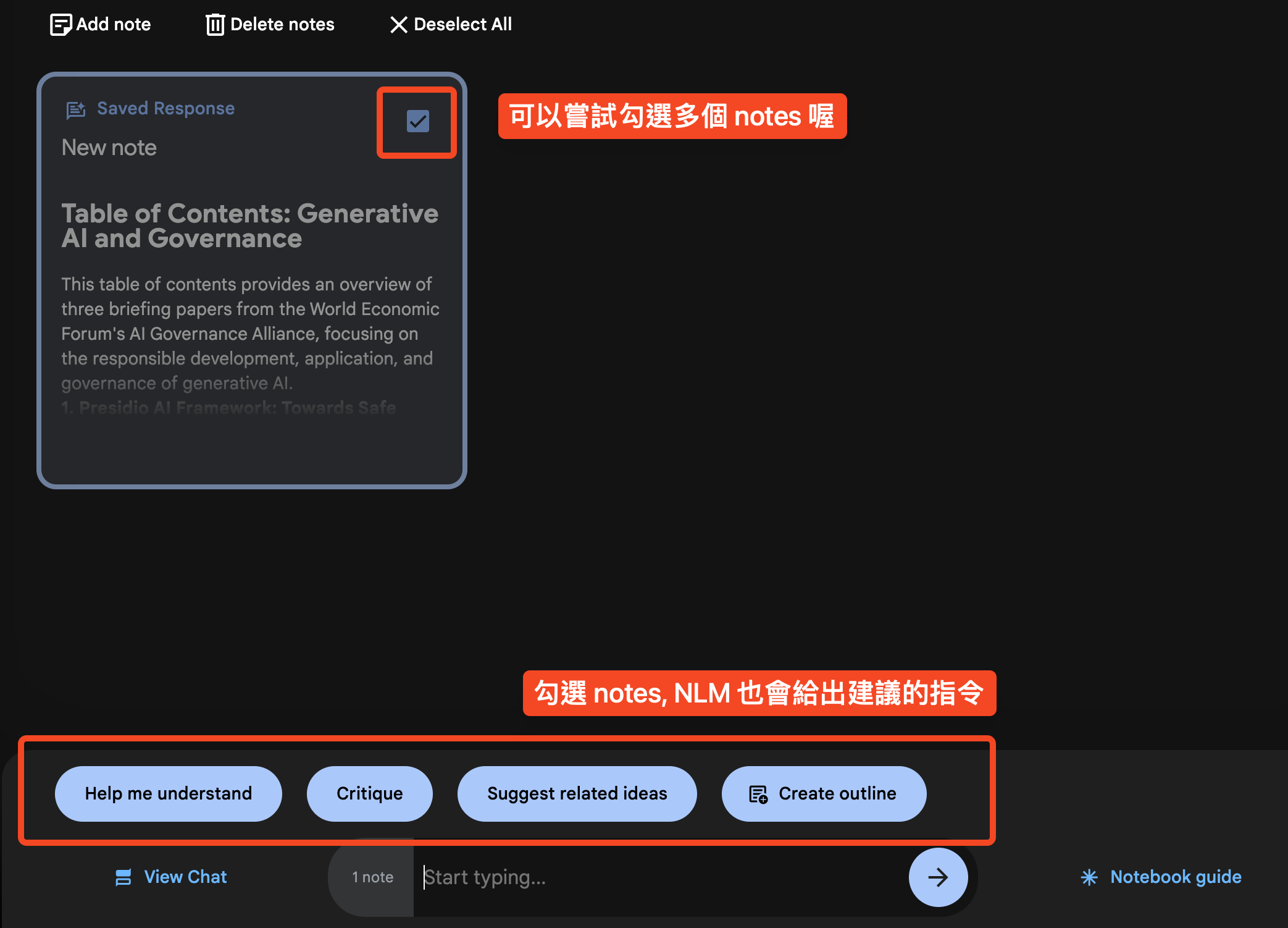 除了可以勾選 sources 然後打開 Notebook guide 使用指令以外,NLM 也有提供針對 notes 的指令,當勾選 1 個或多個 notes 的時候,聊天視窗上面會相應跳出內建的指令,這些指令對於激發新的想法也很有幫助!
