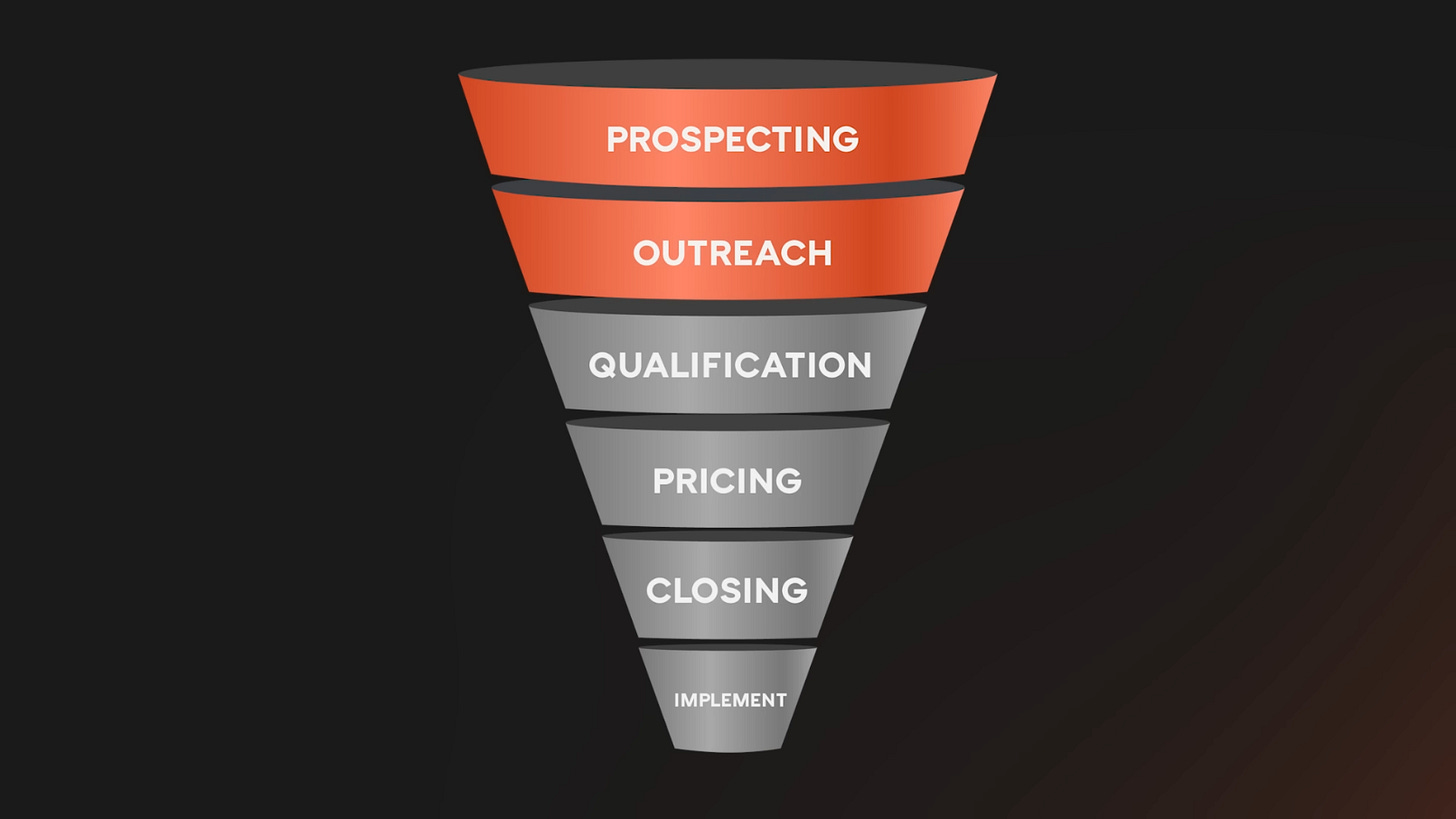 銷售漏斗包括七個關鍵階段:1. 潛在客戶開發、2. 接觸、3. 資格審核、4. 演示、5. 定價、6. 成交和 7. 實施。