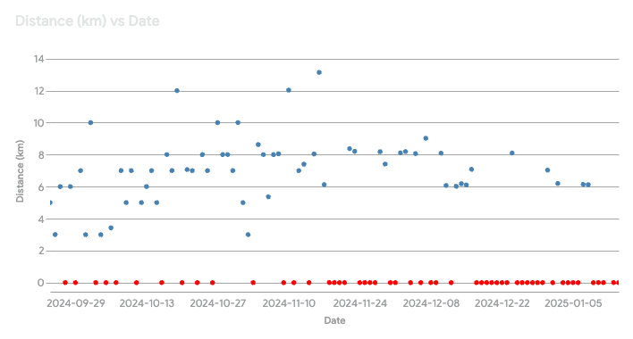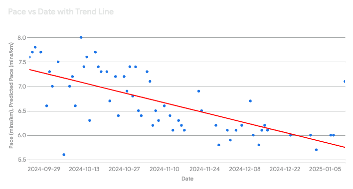 從 2024.09.24 開始,我開了一個 Google Sheet 當作訓練日誌,紀錄每天跑的距離和時間。利用 Gemini 做個統計數據:
